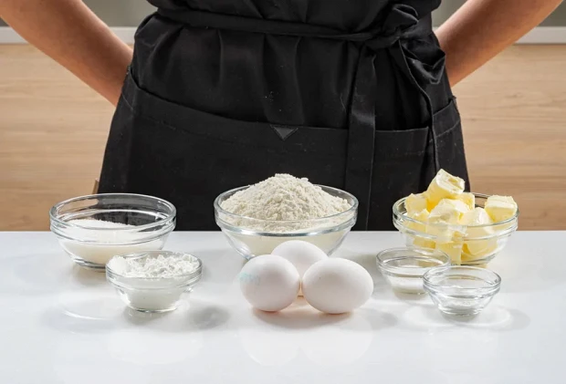 Подготовьте все ингредиенты: 170 грамм пшеничной муки, 80 грамм сахара, 160 грамм сливочного масла, три куриных яйца, 20 грамм крахмала, 5 грамм разрыхлителя, 10 грамм ванильного сахара и соль, взятая по вкусу. Заранее вытащите сливочное масло из холодильника.