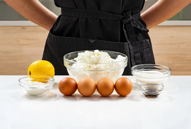 Подготовьте все ингредиенты: 700 грамм творога, 100 грамм сахара, четыре яйца, щепотку соли, растительное масло, взятое по вкусу, 30 грамм пшеничной муки, 5 грамм лимонной цедры и одну чайную ложку ванильной пасты.