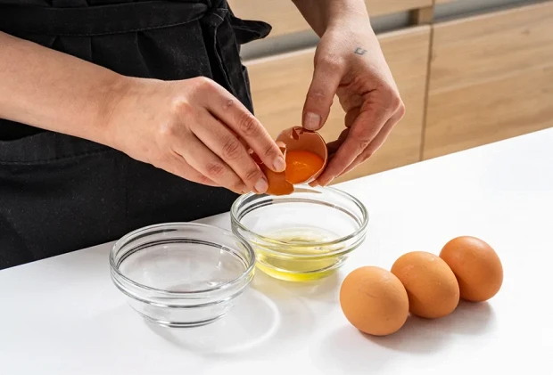 Отделите белки от желтков. Это нужно, чтобы запеканка была пышной — за это отвечают взбитые белки.