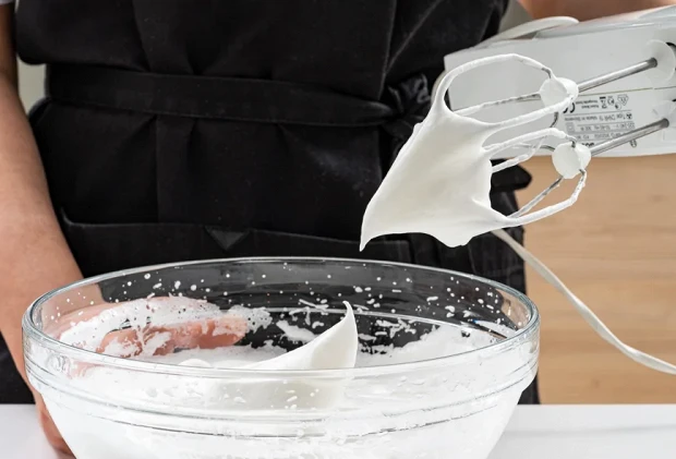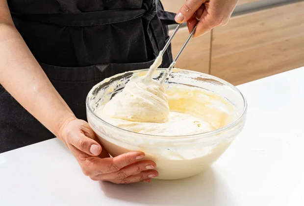 Взбейте с помощью миксера до твердых пиков белки, соединенные с оставшимся сахаром и щепоткой соли. Белки должны быть взбиты очень хорошо — именно они отвечают за пышность запеканки.