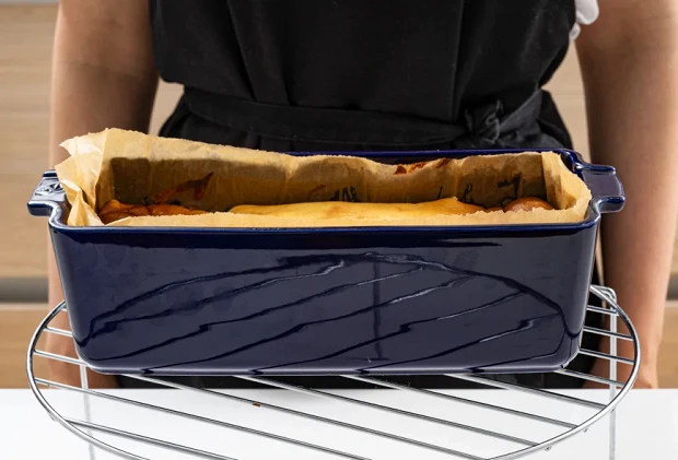 Готовой запеканке нужно дать полностью остыть в форме на решетке. После этого вы обнаружите, что запеканка немного опала, но пусть вас это не тревожит — она останется пышной и нежной.