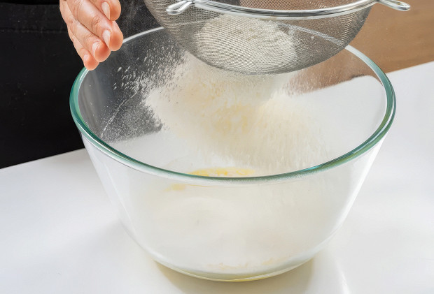 В отдельную миску выложите яичные желтки, добавьте растопленное охлажденное сливочное масло и молоко. Просейте в ту же миску муку с разрыхлителем. Быстро перемешайте венчиком до однородности (взбивать не нужно!).