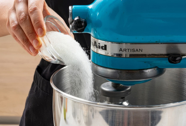 Не переставая взбивать, начните по ложке добавлять сахар. Взбивайте до состояния, которое кондитеры называют «до жестких пиков», это означает, что масса должна стать гладкой, плоской и глянцевой, а сахар полностью раствориться.