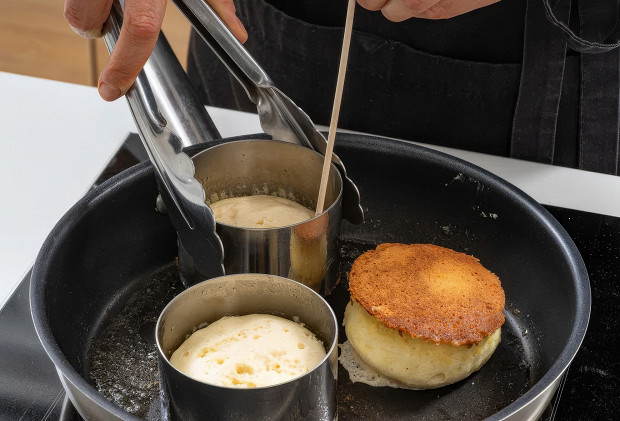 Главный секрет приготовления панкейков — во взбитые в плотную пену яичные белки подмешивают совсем немного муки. Готовят панкейки на сковороде, как обычные оладьи, но не жарят, а бережно доводят до готовности на пару, как суфле, для этого на дно наливается чуть-чуть воды. Вода закипает, превращается в пар, пар пронизывает белковое тесто — и таким образом блинчик-суфле схватывается и не опадает. Чтобы панкейки получились идеально круглыми и пухлыми, лучше использовать кондитерские кольца, обзаведитесь ими заранее.