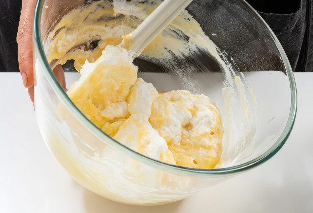 Добавьте в получившееся тесто половину взбитых белков, перемешайте при помощи лопатки. Затем введите остальные белки, очень аккуратно перемешивая, чтобы сохранить объем.