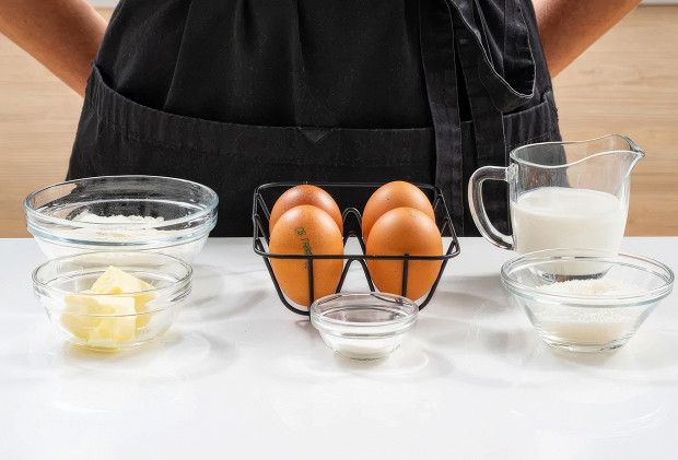 Подготовьте ингредиенты. Основной ингредиент японских панкейков не мука, а взбитые яичные белки. Поэтому на 2 порции нам понадобится 4 яйца и только 80 грамм муки. А также 50 грамм сахара, 35 грамм сливочного масла, 5 грамм разрыхлителя, 100 мл молока и растительное масло.