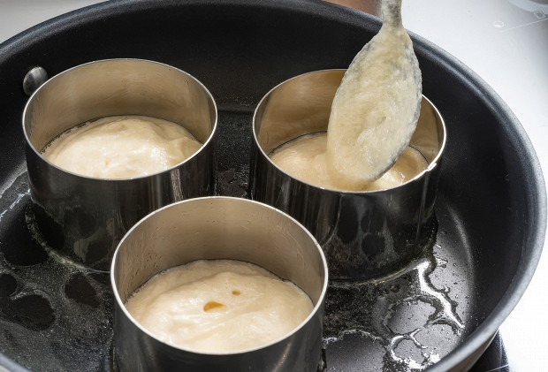 Ложкой наполните кольца получившимся тестом на две трети высоты и поставьте сковороду на самый слабый огонь.