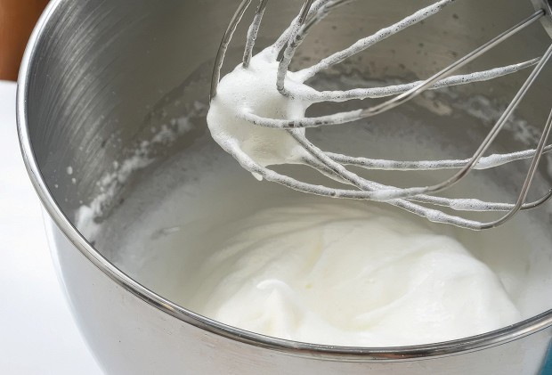 Взбейте миксером белки до состояния, когда белковая масса станет пышной и будет держаться на венчике.