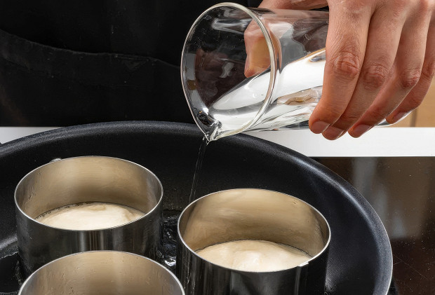 Влейте между кольцами совсем чуть-чуть воды. Накройте сковороду крышкой и держите на слабом огне, пока панкейки не поднимутся, а масса хорошенько не схватится.