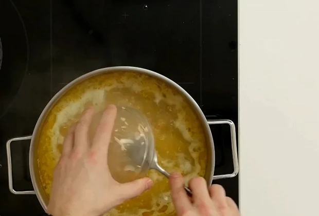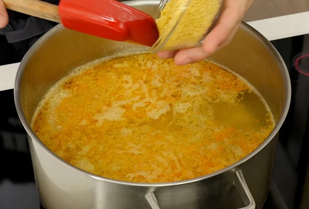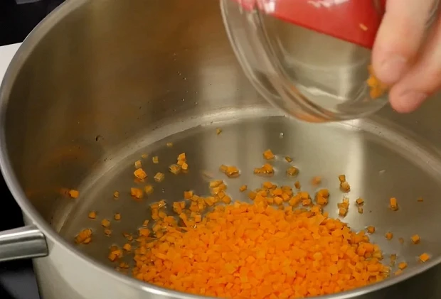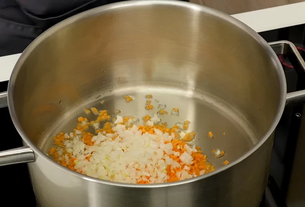 Разогреть на огне 3-литровую кастрюлю для супа , добавить немного растительного масла и обжарить на нем лук и морковь до мягкости и легкого золотистого цвета.