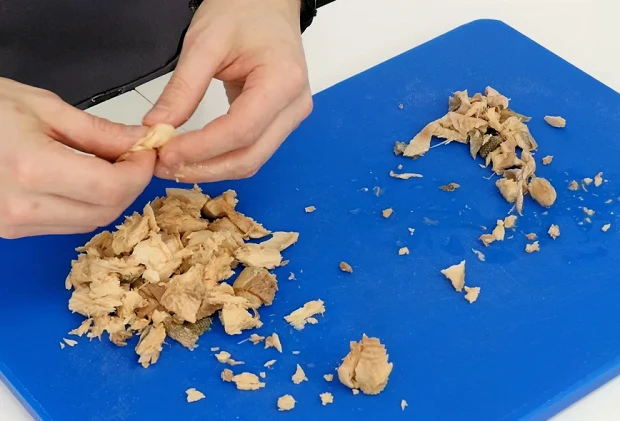 Рыбу разобрать на небольшие кусочки, избавив от костей.