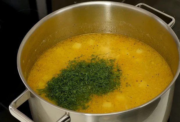 В конце варки суп посолить, поперчить и посыпать укропом.