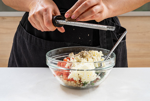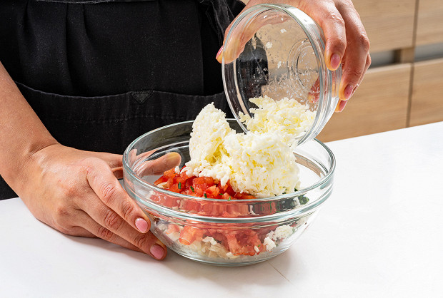 Ножки грибов мелко нарежьте и соедините в миске их, помидоры, сыр и петрушку.
