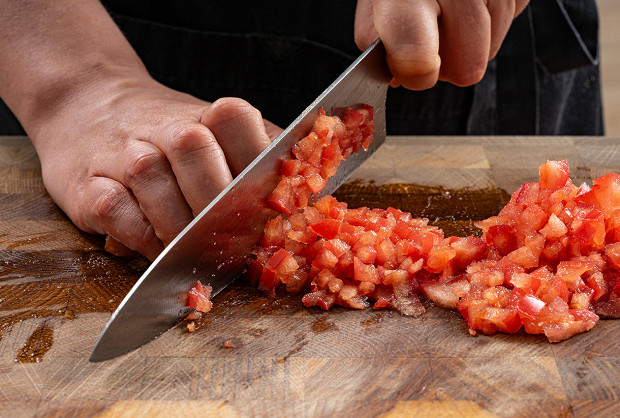 Помидор разрежьте на четыре части, удалите сердцевину с семенами, мякоть нарежьте мелкими кубиками.