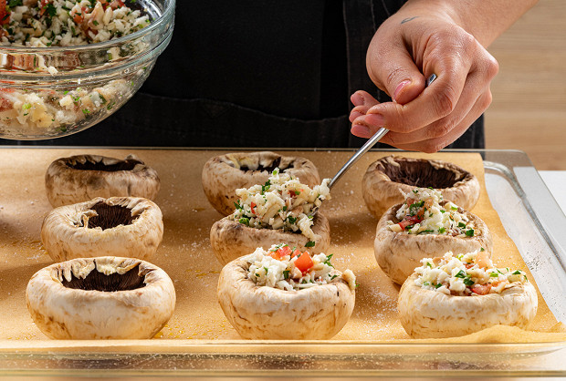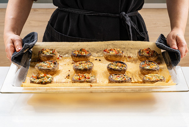 Разложите начинку в шляпки грибов. Не стоит набивать их слишком сильно — даже если начинка останется, ее можно пустить на брускетты или бутерброды.