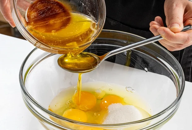 В большой миске замесить тесто для блинов. Взбить яйца вместе с сахаром и солью, добавить 60 грамм карамелизированного масла и перемешать до однородного состояния.