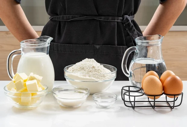 Подготовить все ингредиенты. На восемь порций блинов вам понадобится 300 грамм муки, 500 мл молока, 4 яйца, 60 грамм сливочного масла, половина чайной ложки соли, 50 грамм сахара. Также в тесто для блинов нужно будет положить 60 мл предварительно растопленного и карамелизированного сливочного масла. Еще 100 мл карамелизированного масла понадобится для смазывания, оно же выступит в качестве соуса. То есть, если вы планируете подавать блины с начинкой, без карамельного масляного соуса, то 60 грамм сливочного масла вам будет достаточно.