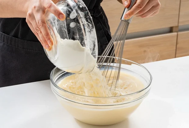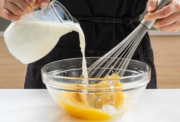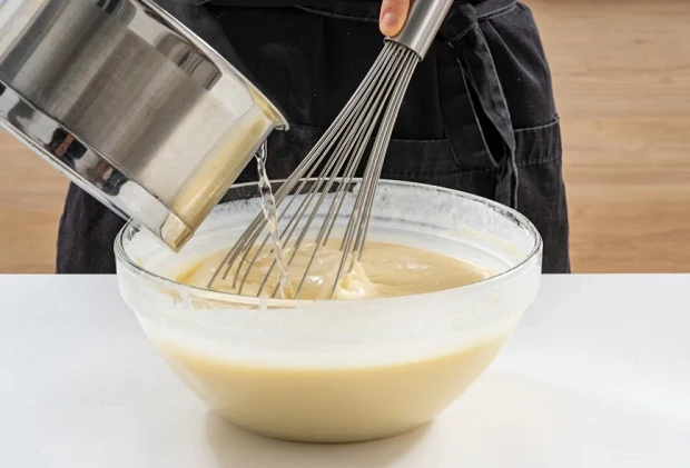 - Чтобы получить более ажурный вариант, молоко или вода (как в данном случае) добавляются в тесто горячими.