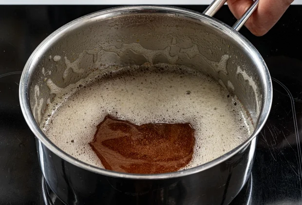 Довести масло на среднем огне до светло-коричневого, коньячного оттенка. Дать ему остыть и процедить через двойной слой марли, чтобы избавиться от пригоревших фракций молочного жира и получить идеально прозрачный результат.