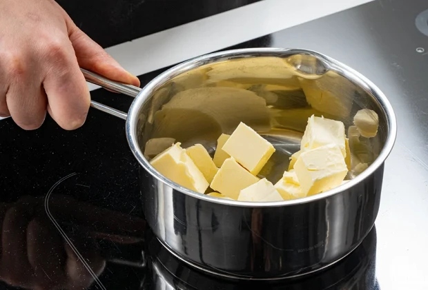 Сначала приготовить карамельное масло. Сливочное масло нарезать кубиком, положить в сотейник и растопить на среднем огне.