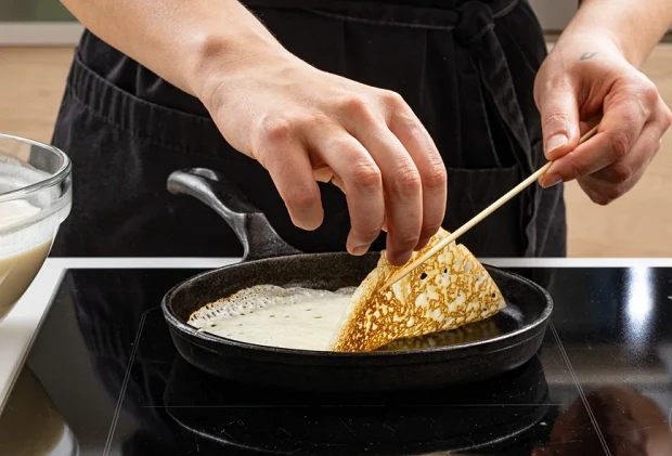 - Переворачивать блины, особенно тонкие, удобнее не лопаткой, а поддев за краешек шпажкой или зубочисткой. Блинчик готов, когда он начинает зарумяниваться до хрустящих краев.