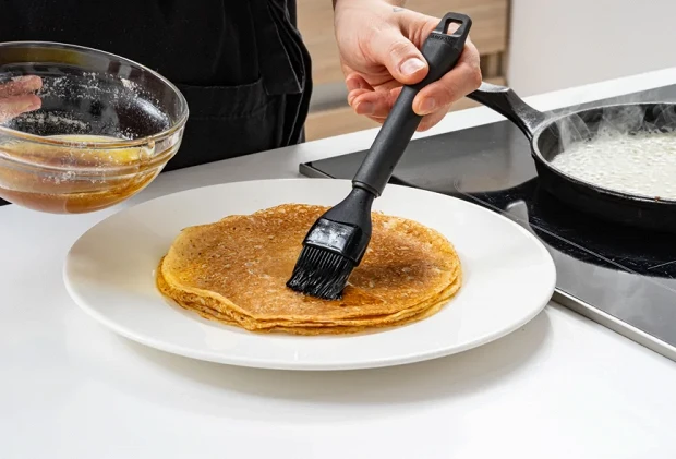 - Выпекают блины на хорошо разогретой сковороде. Для проверки можно капнуть на поверхность воду — она должна почти мгновенно испариться. И лишь потом смазать сковороду маслом.