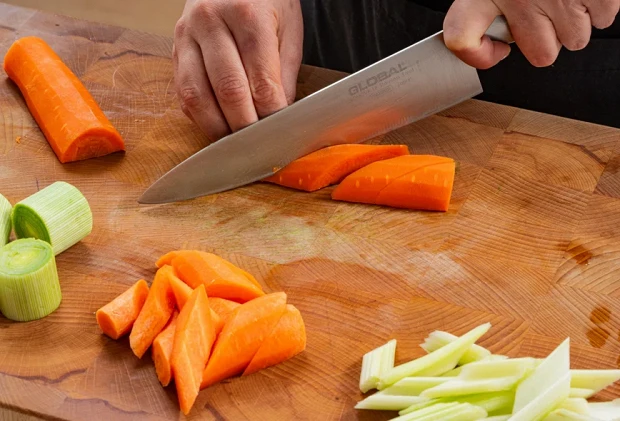 Нарезать крупными кусочками морковь, сельдерей и лук-порей.
