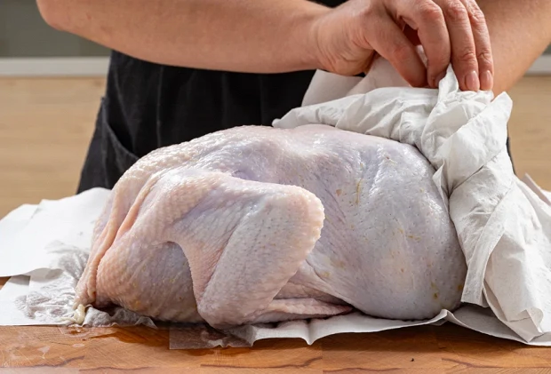 Достать курицу из соленада и обсушить бумажным полотенцем.