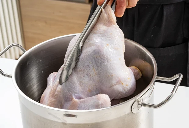 Погрузить курицу в остывший соленад и убрать ее в холодильник на ночь или на 8 часов, если дело происходит с утра.