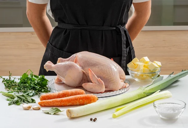 Подготовить все ингредиенты. Вам понадобятся: 1 курица, 3 литра воды, 150 грамм соли, 1 лавровый лист, 3 горошины душистого перца, 200 грамм сливочного масла, по 3 веточки шалфея и тимьяна, 5 веточек петрушки, 2 зубчика чеснока, молотый черный перец по вкусу, 2 моркови, 2 стебля сельдерея и 1 стебель лука-порея.