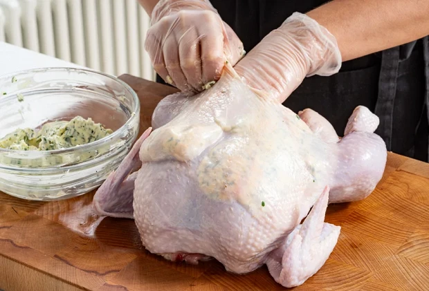 Пальцами отделить куриную кожу от мяса на грудке, образуя таким образом карман. В этот карман поместить пряное масло с травами и равномерно распределить его, не порвав кожу. Также небольшим количеством масла можно обмазать курицу внутри и снаружи.