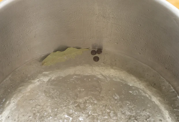 Добавить лавровый лист и душистый перец, довести воду до кипения, затем снять с огня и дать остыть.