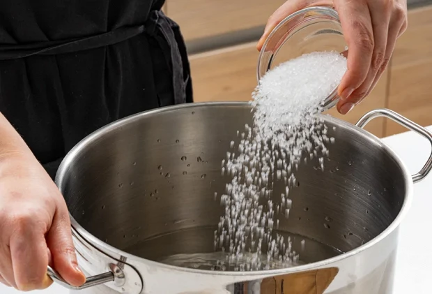 В большой и глубокой кастрюле смешать воду с солью в пропорции 50 грамм соли на 1 литр воды.