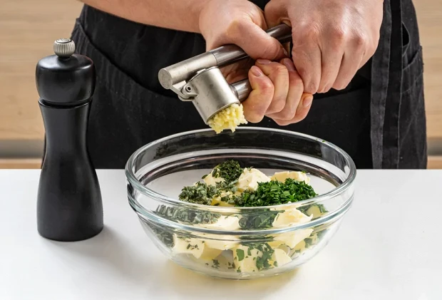 Размягченное при комнатной температуре сливочное масло перемешать с нарубленной зеленью, раздавленным через пресс чесноком и черным перцем.