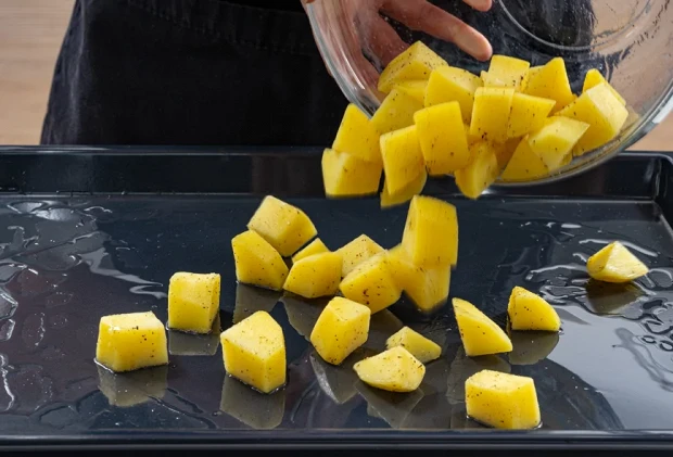 В большой противень влейте 2–3 ложки растительного масла и уберите его в духовку на 5 минут, чтобы разогреть. Затем распределите по противню картофель и запекайте 15 минут.
