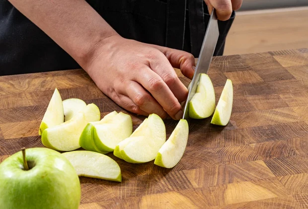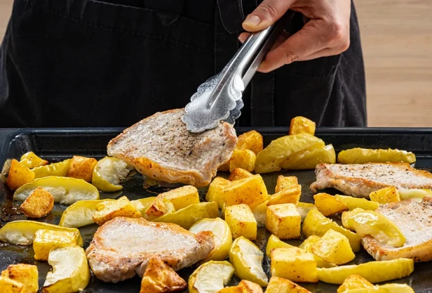 Тем временем подготовьте яблоки: разрежьте их на четвертинки, удалите сердцевину, нарежьте дольками. Выложите яблоки к картофелю, перемешайте запекайте все вместе еще 15 минут. Выключите духовку и дайте ей остыть, пока готовите отбивные.