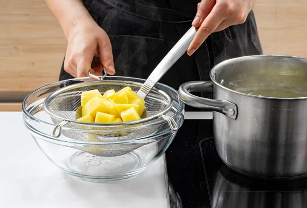 Сложите картофель в кастрюлю с кипящей водой варите 5 минут, затем откиньте на дуршлаг, чтобы стекла вода, и переложите в чистую миску.