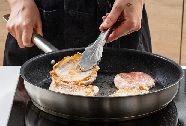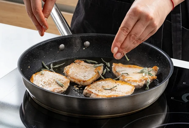 Разогрейте в большой сковороде 1 столовую ложку растительного масла. Отбивные посолите и поперчите с двух сторон. Обжарьте отбивные 6–8 минут с каждой стороны, до румяной корочки.