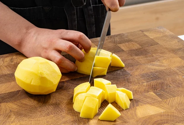 Картофель очистите и нарежьте кубиками со стороной в 2–3 см.