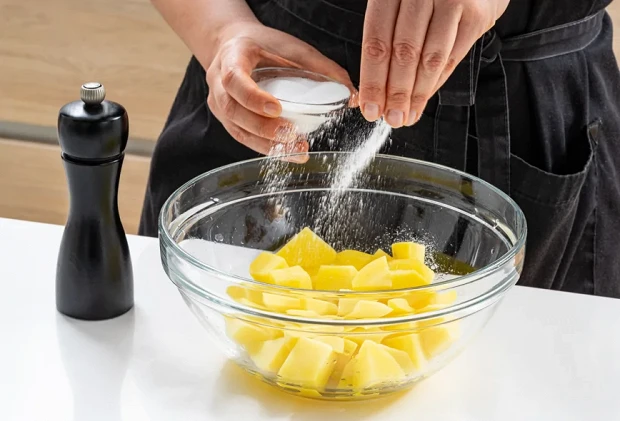 Посолите и поперчите картофель, перемешайте и оставьте.