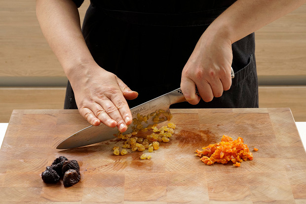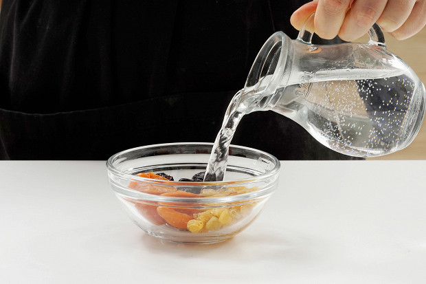 Замочите курагу, изюм и чернослив в горячей воде на 15 минут.