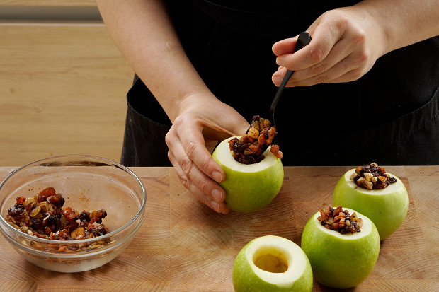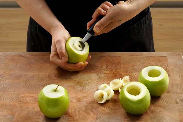 Займитесь яблоками. Срежьте верхушку с черешком — совсем немного, сантиметра полтора. Чайной ложкой или ножом удалите семена и сделайте круглое углубление в мякоти. «Стенки» яблок должны остаться целыми.