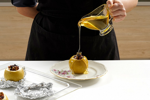 Перед подачей дайте яблокам немного остыть, аккуратно, чтобы не обжечься, разверните фольгу и полейте их медом и кленовым сиропом.