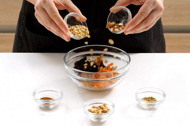 Приготовьте все ингредиенты. На 4 яблока вам понадобится для начинки по 25 грамм (то есть 1–2 штучки) кураги, столько же чернослива и изюма, по столовой ложке разных орехов — кедровых, миндаля, грецких. Из специй возьмите чайную ложку корицы, немножко молотого имбиря, добавьте мед по вкусу и кленовый сироп, а также сахарную пудру.
