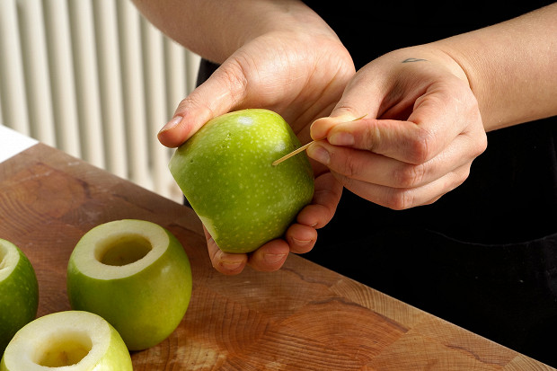 Наколите кожицу яблок в нескольких местах зубочисткой, чтобы она не лопнула при запекании.
