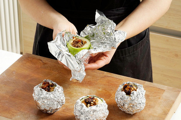 Заверните каждое яблоко в фольгу так, чтобы сверху начинка осталась свободной. Выложите яблоки на противень и отправьте в разогретую до 180 градусов духовку на 25 минут.