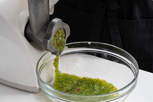 Измельчите крыжовник при помощи мясорубки или блендера.