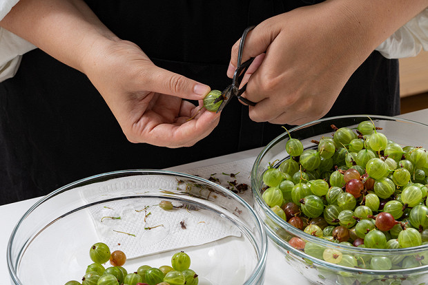 Крыжовник промойте, обсушите, разложив на полотенце, отрежьте хвостики и плодоножки.
