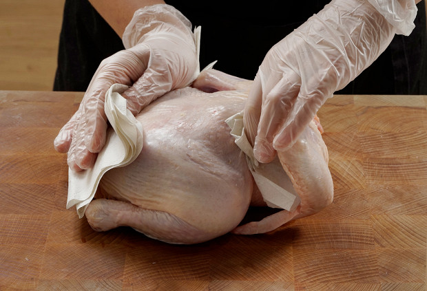 Подготовьте доску так, чтобы она не скользила по столу. Бывает доска с силиконовыми выступами, которые крепко держатся за поверхность. Можно просто положить под доску влажную ткань или полотенце. Доска обязательно должна быть устойчива, иначе процесс разделки может оказаться небезопасным. Просушите курицу бумажными полотенцами, мыть ее совсем не обязательно. Подготовьте удобный нож.