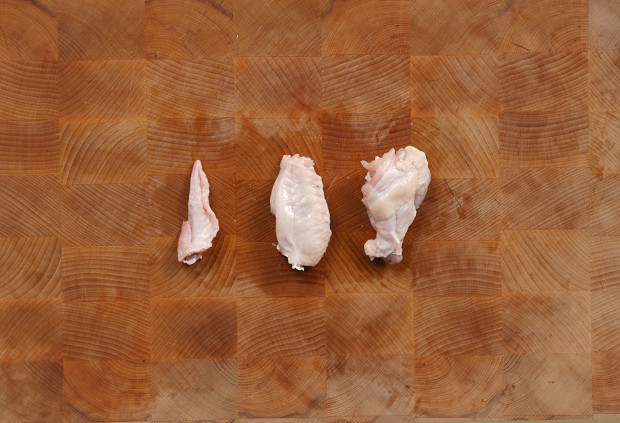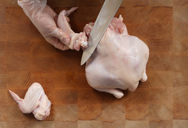 Начните разделку с крыльев. Возьмитесь крепко за основание крыла и выверните его в районе сустава. Делается это буквально за несколько секунд, после чего вам нужно будет просто перерезать кожу и мясо, соединяющие крыло с тушкой.
